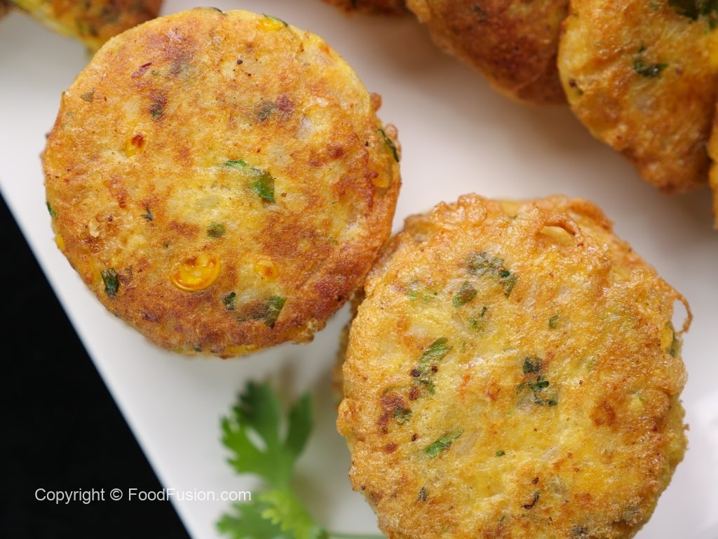 -In frying pan,heat cooking oil,dip tikkis in whisked eggs & shallow fry on medium flame from both sides until golden brown (makes 14).