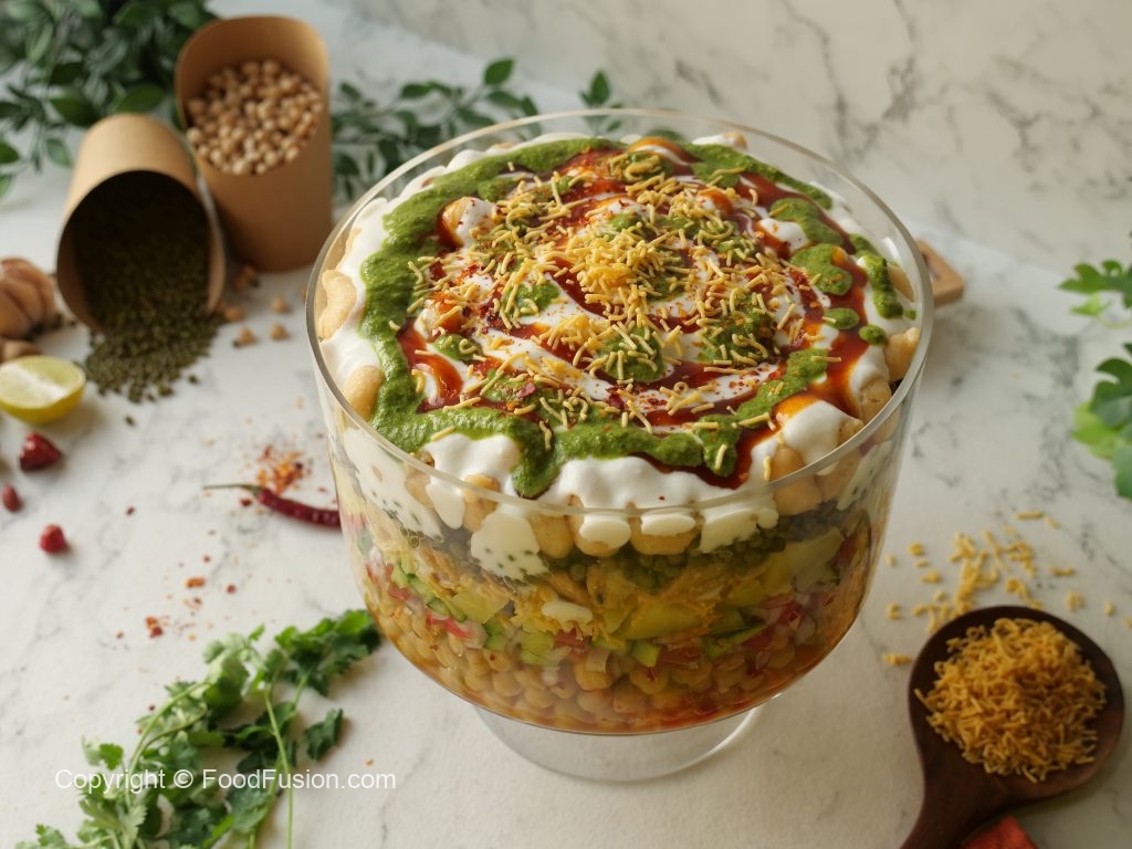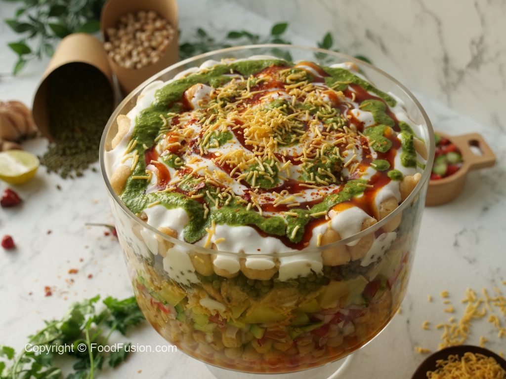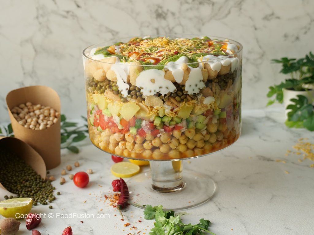 -Deep serving dish mein boiled chanay,chaat masala,lal mirch crushed,tayyar hari chutney,mixed vegetables salad,boiled aalo,tayyar meethi chutney,mong phali,sev nimco,tayyar dahi,meethi chutney,hari chutney,papri,boiled sabut mong daal,chaat masala,dahi phulkiyan,dahi,meethi chutney,hari chutney,lal mirch crushed aur sev nimco dal ker serve karein!