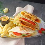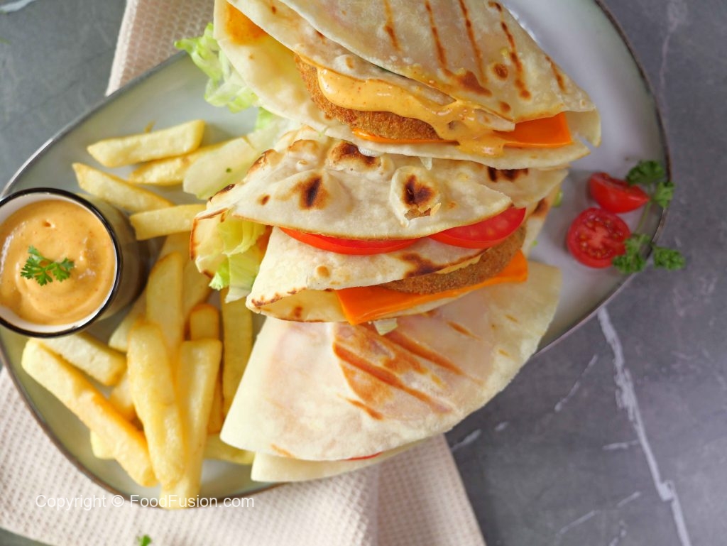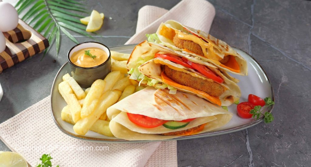 -Add sauce of your choice on one quarter,cheese slice & potato cutlet on second,tomato & cucumber slices on third quarter & add iceberg lettuce on fourth quarter & fold each side on one another making a wrap & serve!