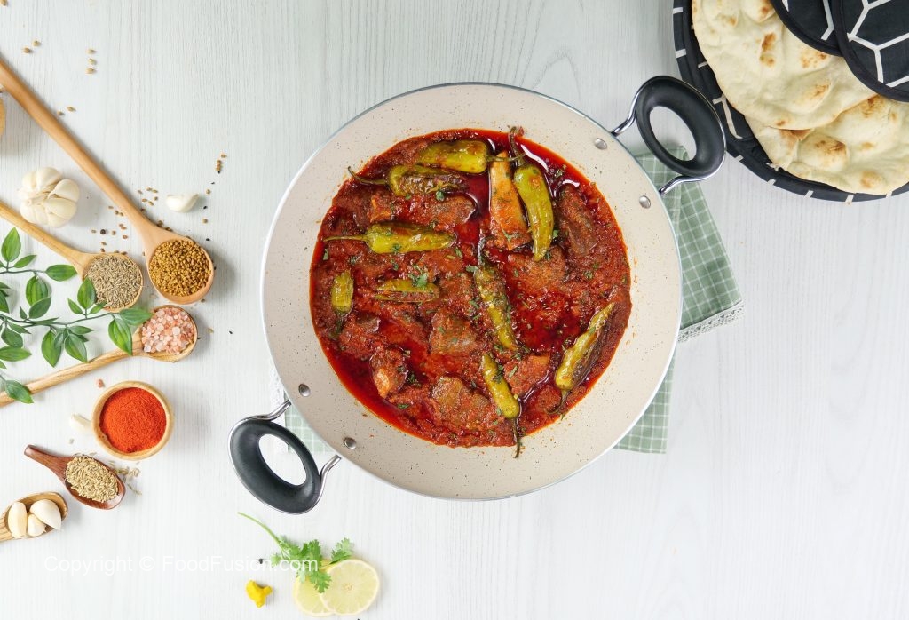 -Fried stuffed chillies ko mutton gravy mein dal dein aur lemon juice dal ker dhak dein aur halki ancch per 3-4 minutes kliya paka lein.