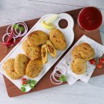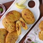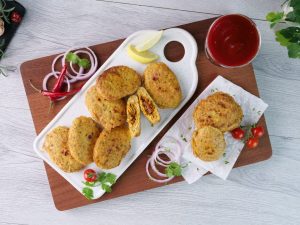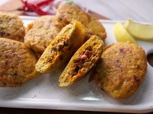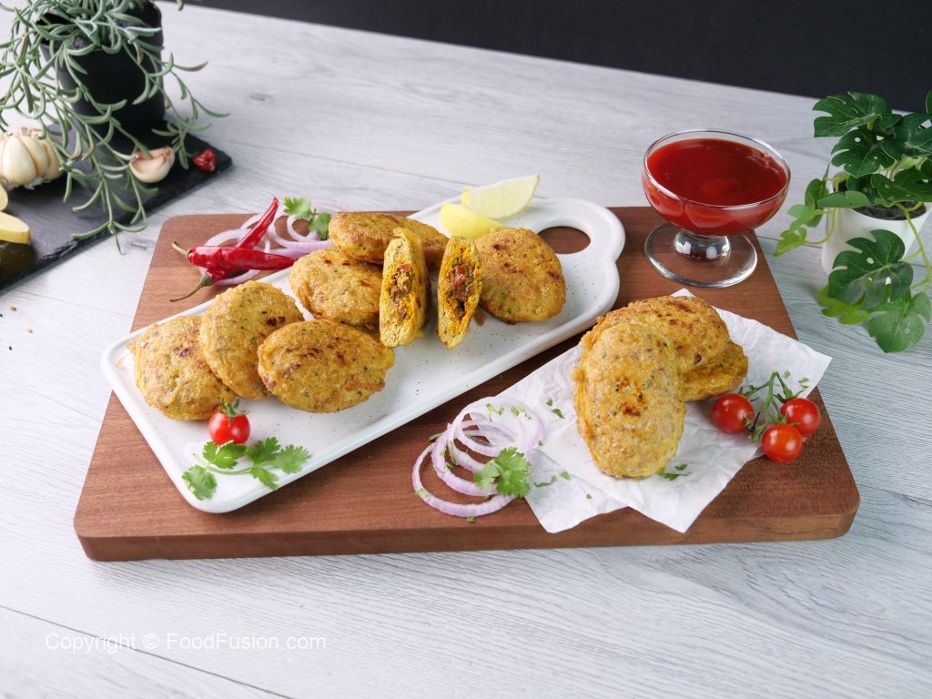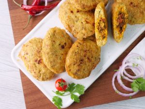 Grease hands with oil,take a mixture (55g),make a ball & flatten on your palm,add mixed pickle (1 tsp),cover properly & make kababs of equal sizes (makes 10).