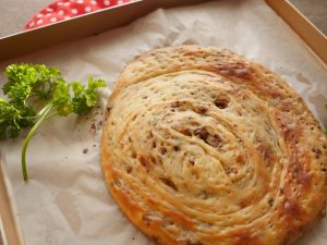 Dough per maida chirak dein aur rolling pin ki madad sa bail lein (roll as thin as possible).