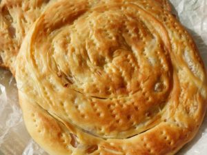 Dough per maida chirak dein aur rolling pin ki madad sa bail lein (roll as thin as possible).