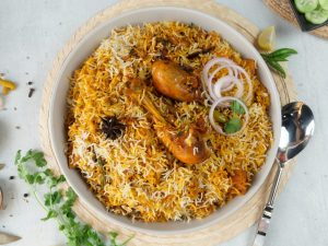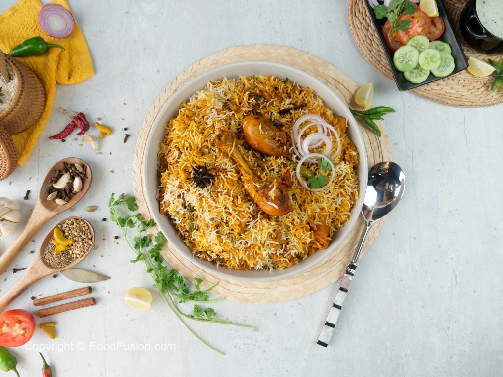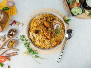 Bowl mein fried pyaz,tamatar,hari mirchein,aalo bhukara,podina,hara dhania,biryani masala aur lemon juice dal ker ache tarhan mix ker lein & side per rakh dein.