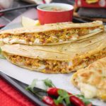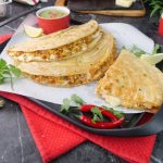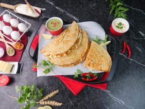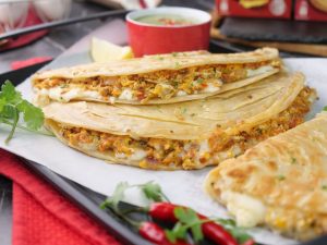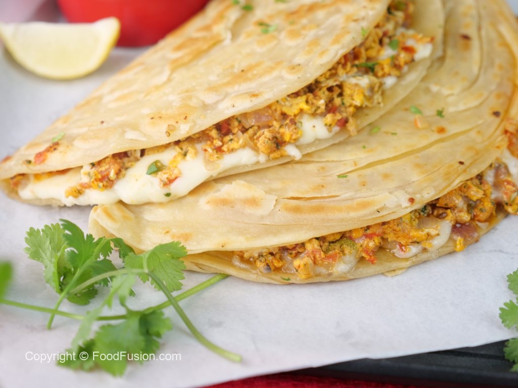 -On one side of paratha,add mozzarella cheese,prepared filling,cheddar cheese & flip the other side of paratha over it & cook from both sides with desi ghee until cheese melts (makes 4) & serve!