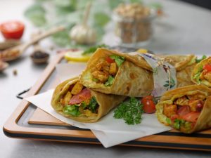 -Add & spread prepared chana dahi sauce,add chicken filling,tomato,salad leaves & fold both sides.