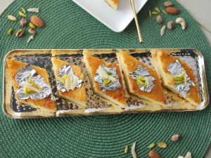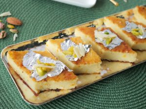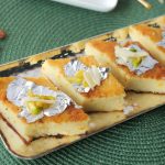 -Cut into diamond shape and garnish with silver leaves,pistachios,almonds & serve!