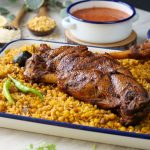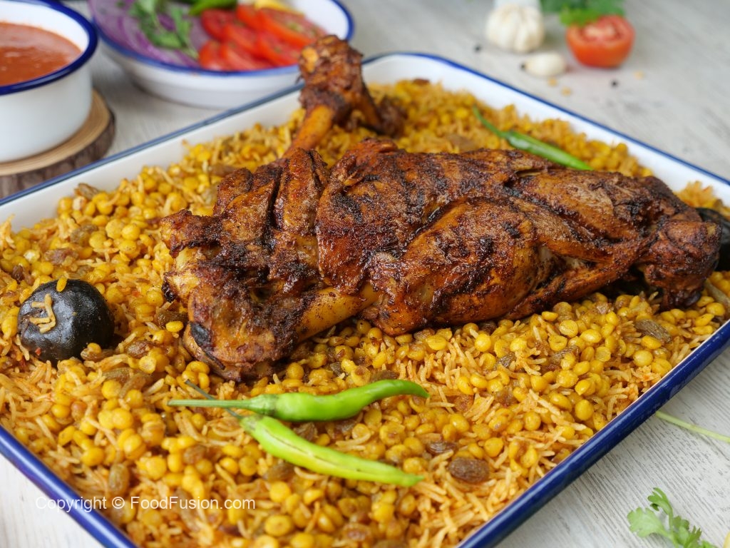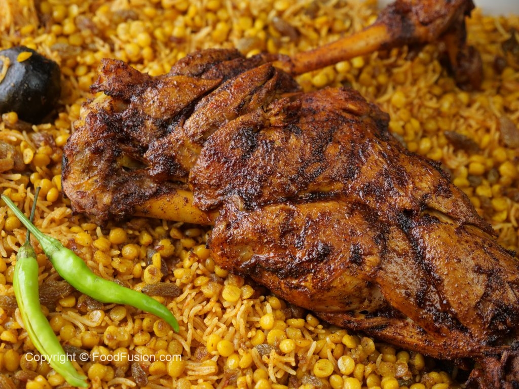 -On a serving platter,add & spread prepared rice,daal & raisins,mutton leg & garnish with green chillies & serve!