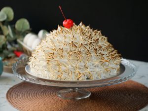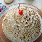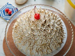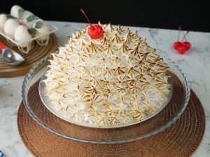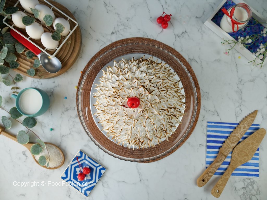 Blow torch sa meringue ko toast ker lein & slices mein cut ker ka serve karein!