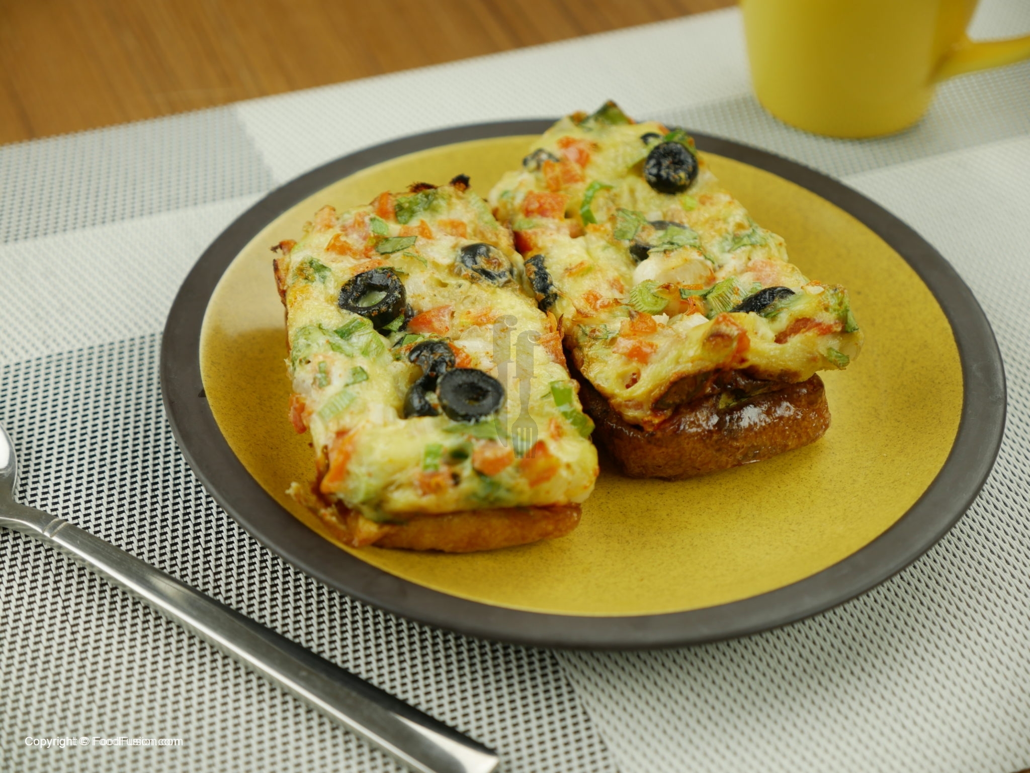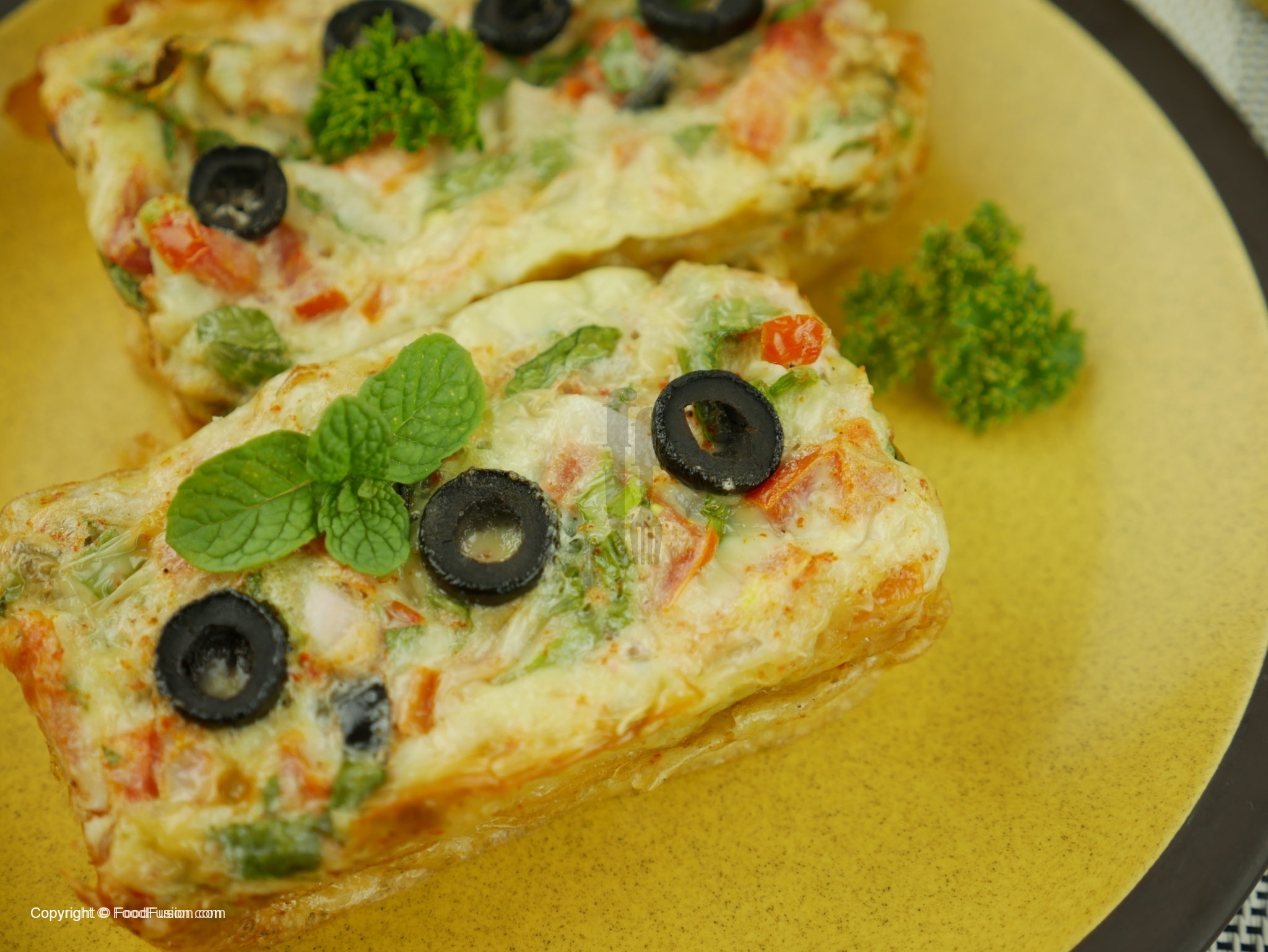 Pour the mixture in the tray compartments and put cheese and few olives on top of it.
