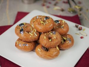 -In warm sugar syruy,add balushahi & let them soak for 30 minutes.