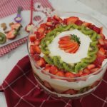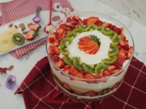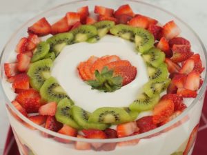 -Add olper’s whipped cream,strawberry puree,add strawberry,pineapple & kiwi slices.