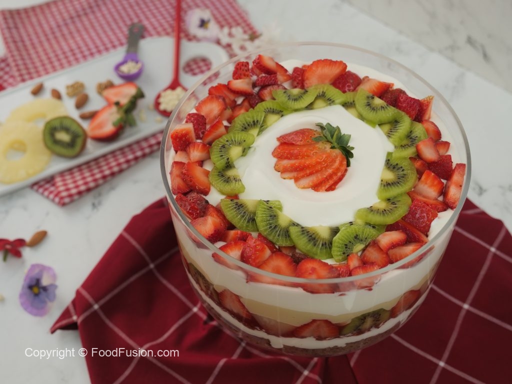 A must try dessert recipe for the entire family. This banana bread fruit trifle gives a new meaning to what a perfect dessert should be. #HappyCookingToYou #Fodofusion #OlpersCream