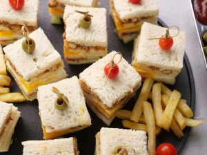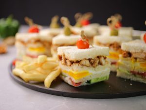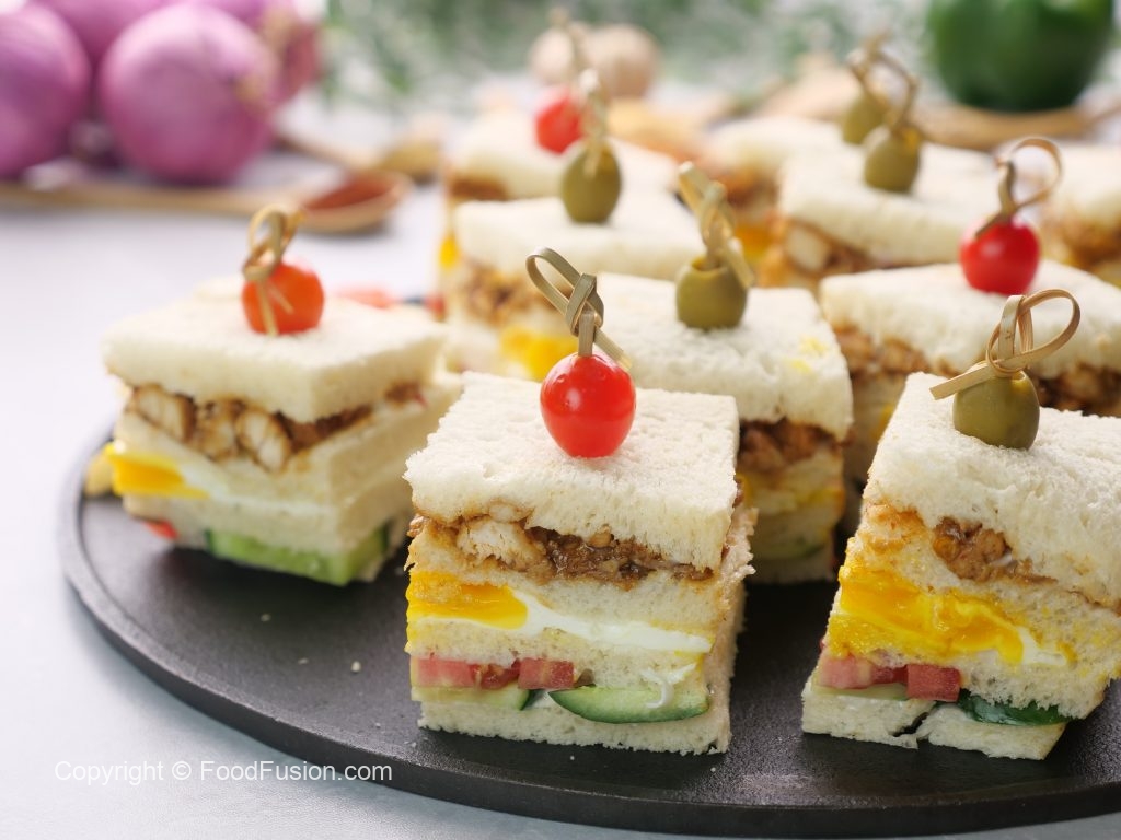 -Four bread slices per mayonnaise dal dein,ek slice per kheera aur tamatar dal dein aur dosray slice per cooked anda dal ker namak aur kali mirch crushed chirak dein.