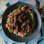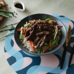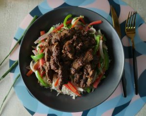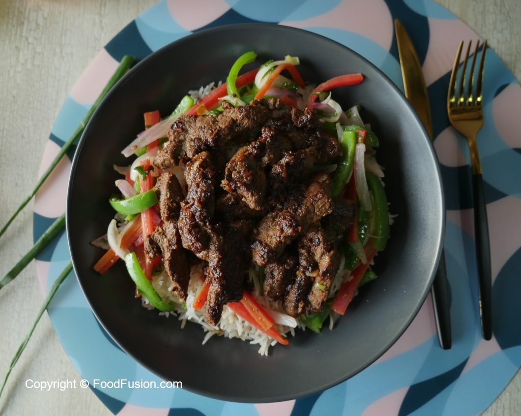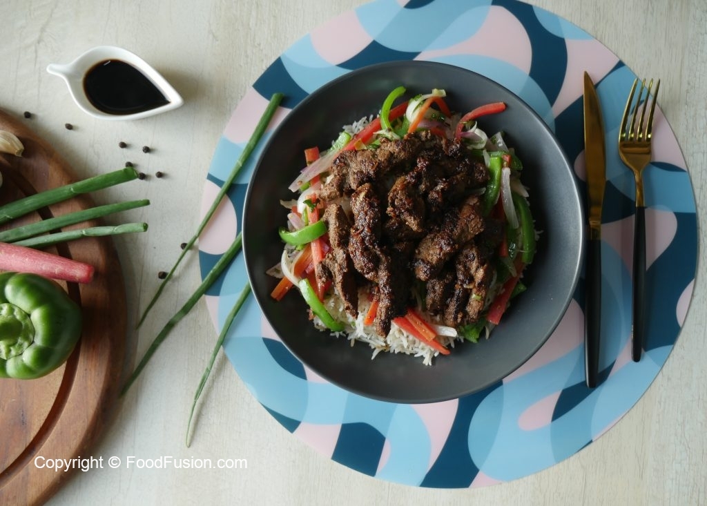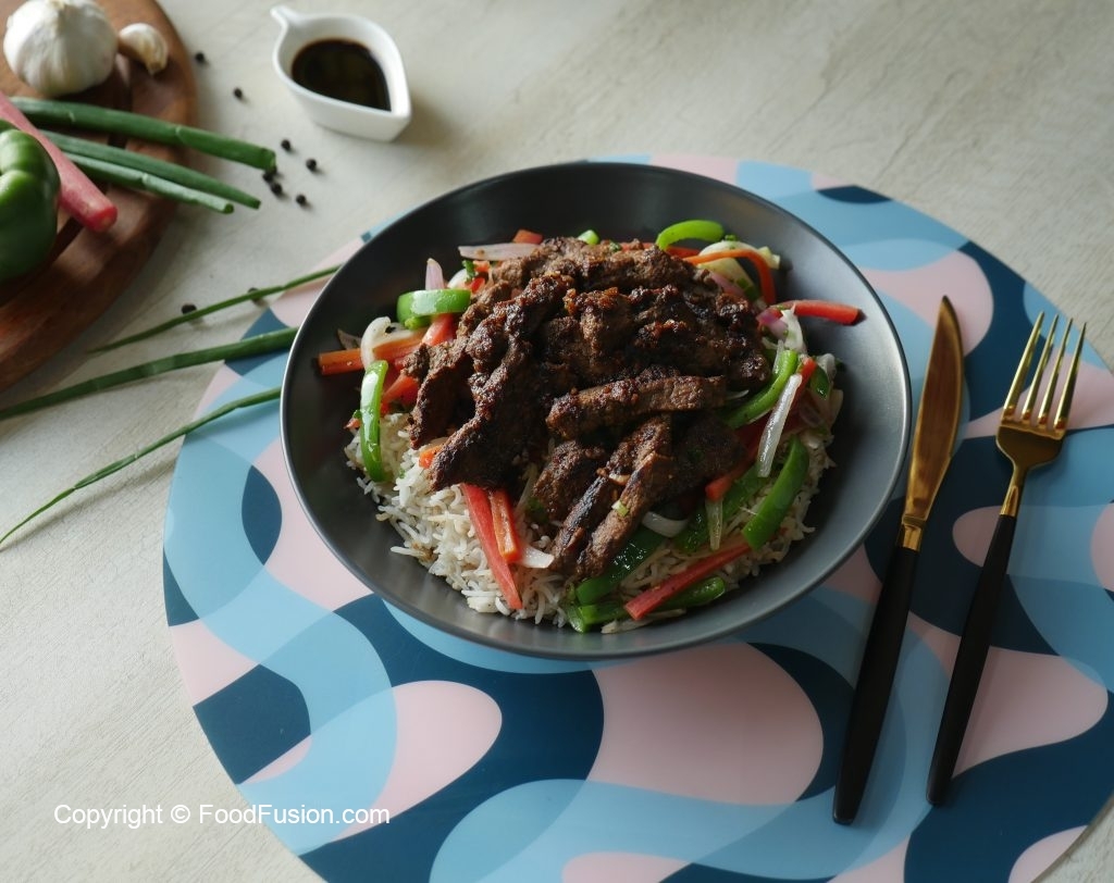 Serving dish mein cooked rice,stir fried vegetables,fried beef strips aur tayyar sauce drizzle ker ka serve karein!