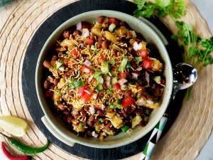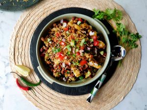 In add serving plate,add prepared chaat,sev nimco,tomato,cucumber,onion,lemon juice,chaat masala,fresh coriander & serve!