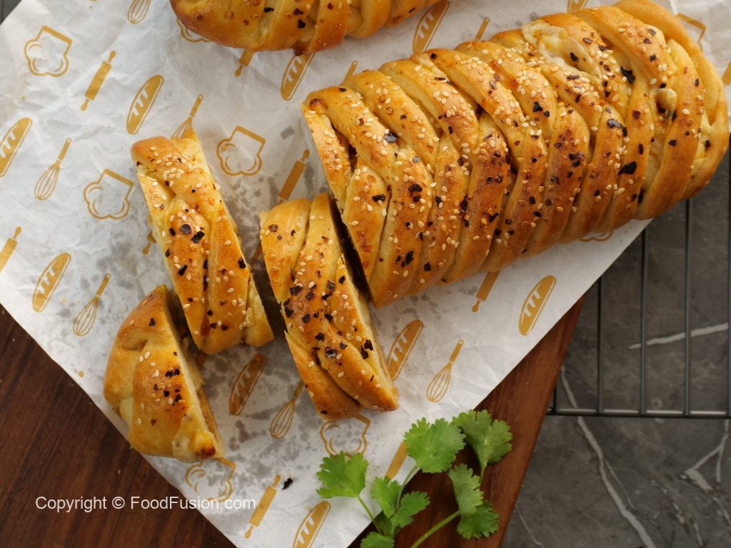 -With the help of the brush,apply egg on braided bread,sprinkle red chilli crushed & sesame seeds (makes 2 large or 3 medium breads).