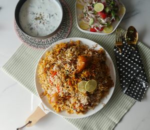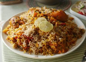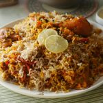 Now add tomatoes & onion mixture,kewra water,yellow food color,boiled brown rice,cover & simmer on low flame for 15-20 minutes.