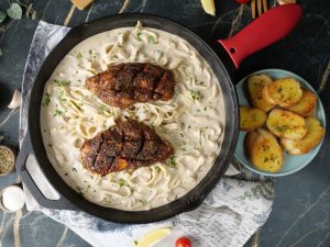 -In a cast iron pan,add cooking oil,place chicken fillets & cook on low flame from both sides until done (5-6 minutes each side) & set aside.
