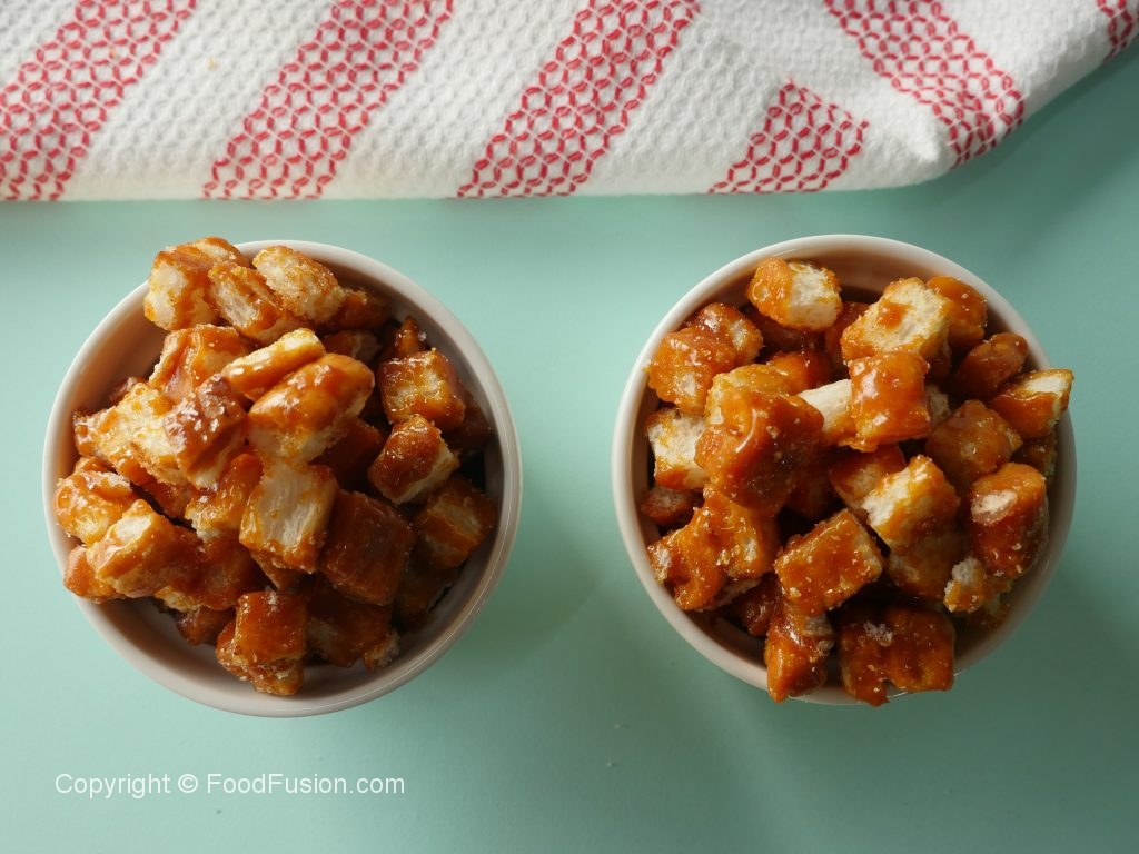 In wok,add bread cubes and toast on low flame until crispy & set aside.