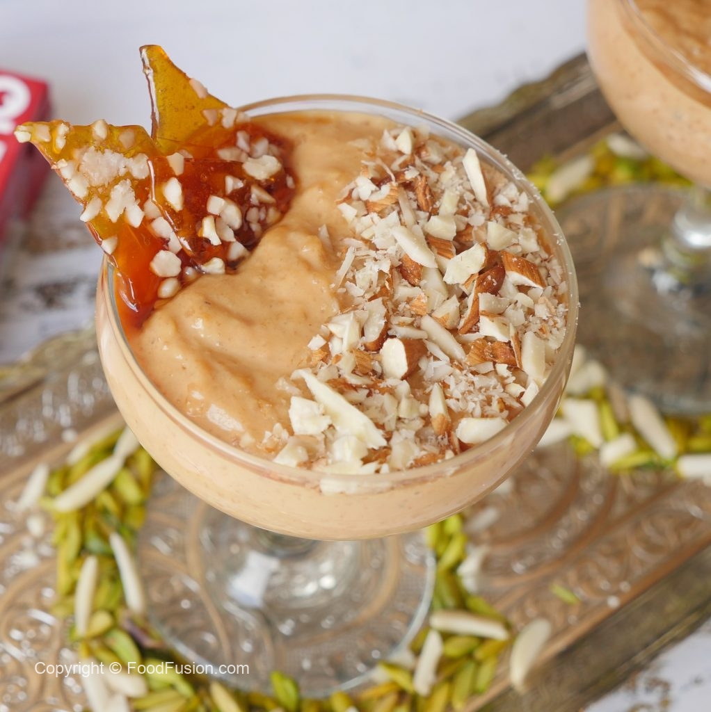 Serving dish mein caramel firni dal dein,badam aur caramel crunch sa garnish ker ke serve karein!