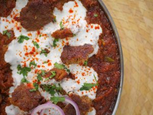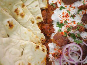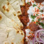 -In a serving platter, add Chapta Cut Kabab Masala, add whisked yogurt, garnish with kashmiri red chilli powder, onion rings, reserved kabab pieces, lemon slices & fresh coriander, and serve with naan!