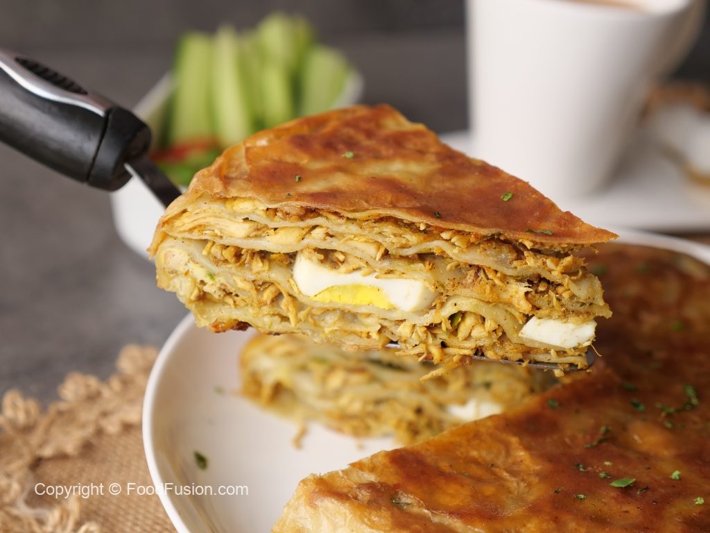 Roll/samosa patti ko anday ka mixture mein dip karein aur layers laga ker chicken filling dal dein.