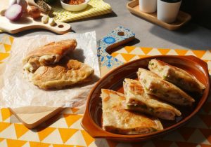 Paratha ki ek side per cheddar cheese,mozzarella cheese,cooked vegetables,fried fish pieces,mozzarella cheese aur cheddar cheese dal dein.