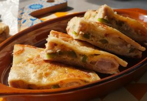 On one side of paratha,add cheddar cheese,mozzarella cheese,cooked vegetable,fried fish pieces, mozzarella cheese and cheddar cheese.
