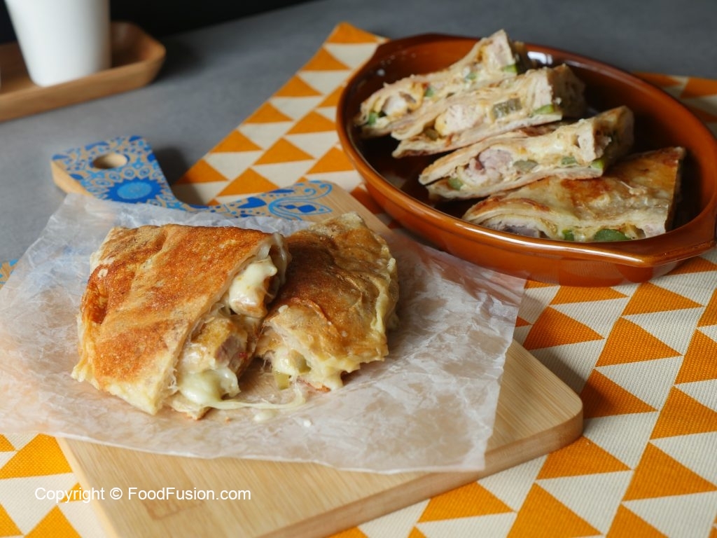 Tawa per mozzarella cheese aur cheddar cheese dal ker pheela dein,cooked paratha rakh ker upper sa cheddar cheese,mozzarella cheese,cooked vegetables,fried fish pieces,mozzarella cheese,cheddar cheese aur lal mirch crushed dal dein.