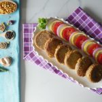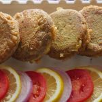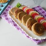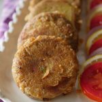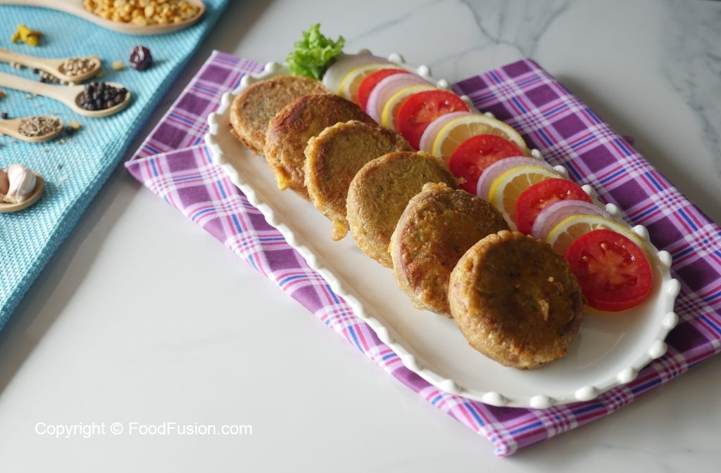 Grease hands with oil,take a mixture (65g) and flatten on your palm,add cheese filling and make kabab of equal sizes (makes 34-35).