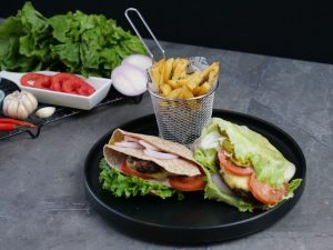 Add cheeseburger patty on one quarter side,add yogurt & tomato slices on second quarter side, tomato ketchup & onion on third quarter side,mustard paste,pickled cucumbers & lettuce leaves on fourth quarter side & fold each side on one another making a wrap & serve!