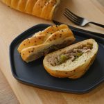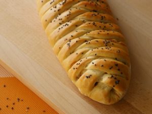 Brush ki madad sa anda+doodh ko braided bread per laga lein aur kalay til chirak lein.