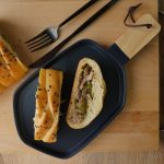 Add cooked beef stuffing in the centre,mozzarella cheese,cheddar cheese and jalapenos.