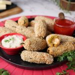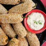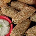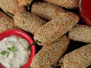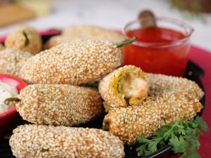 -Stuffed green chillies with prepared filling,coat in gram flour batter then coat with sesame seeds (makes 30-35) & let them rest for 15 minutes.