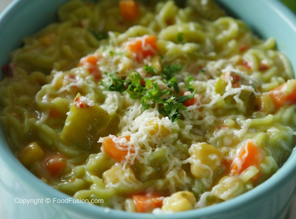 Shimla mirch,kernel corns,green noodles cake,taste maker,soy sauce,lal mirch crushed,namak aur cheddar cheese dal ker ache tarhan mix karein.