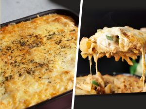 -Upar se mix cheese daalein aur corners par brush ki madad se paani lagayein.