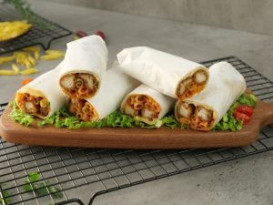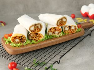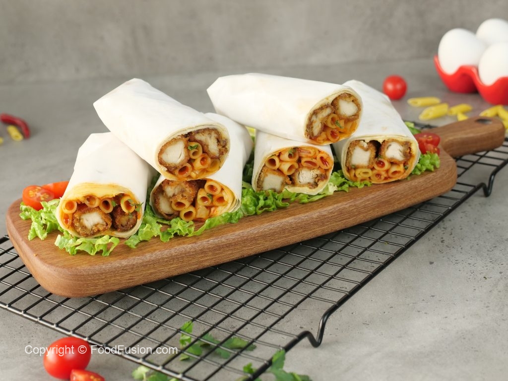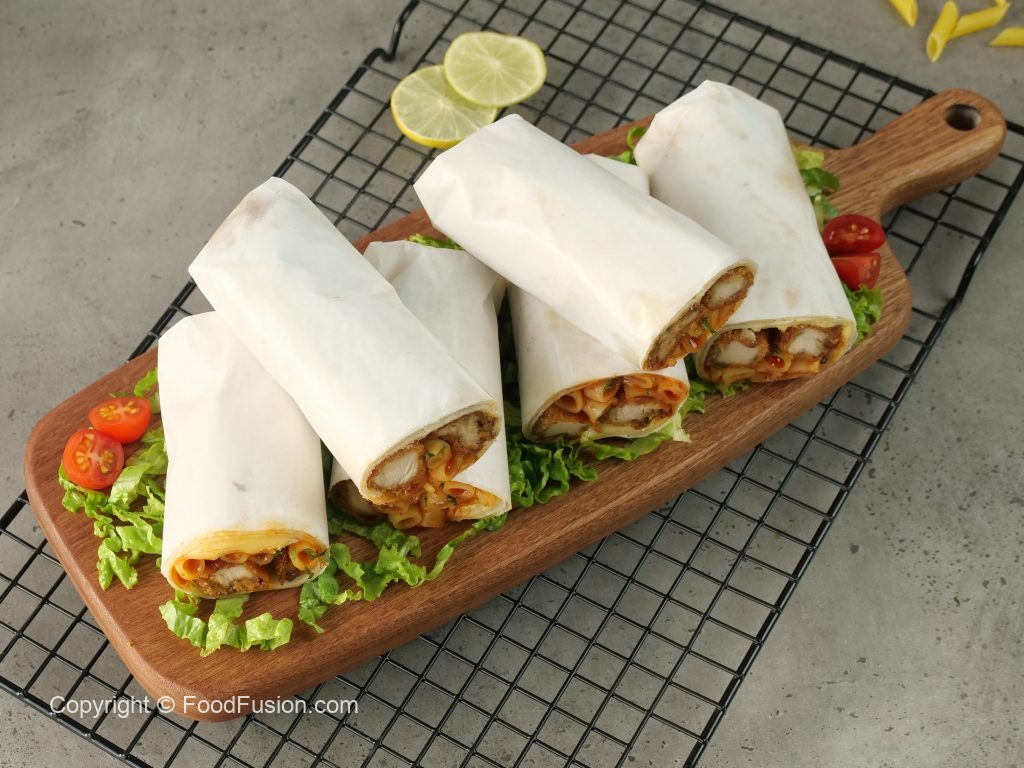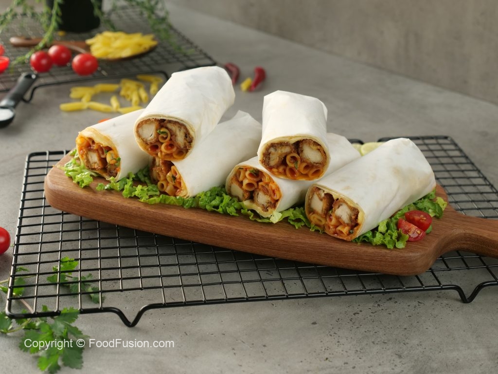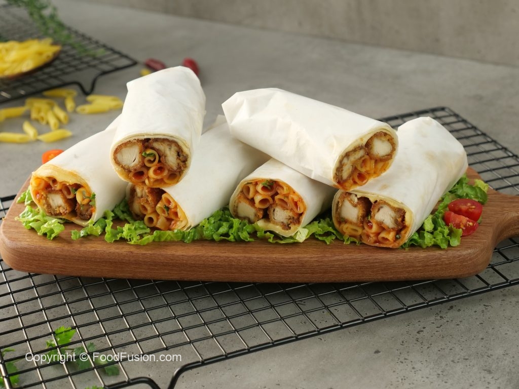 -On a tortilla bread, place cheese slices, fried chicken, prepared pasta & roll out tortilla.