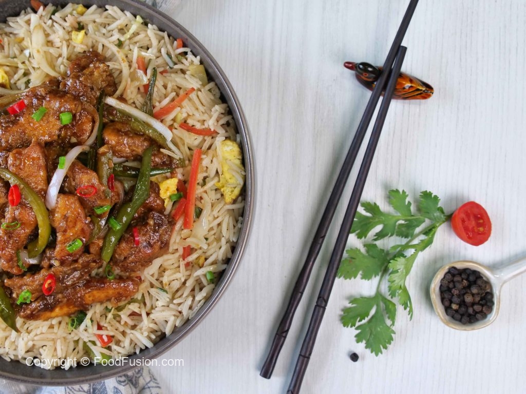 -Boiled chawal,kali mirch powder,pink salt,safed mirch powder,chicken powder,soy sauce,chilli sauce aur sirka dal ker ache tarhan mix karein aur tez ancch per ek minute kliya paka lein