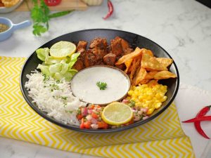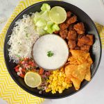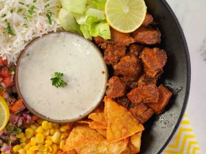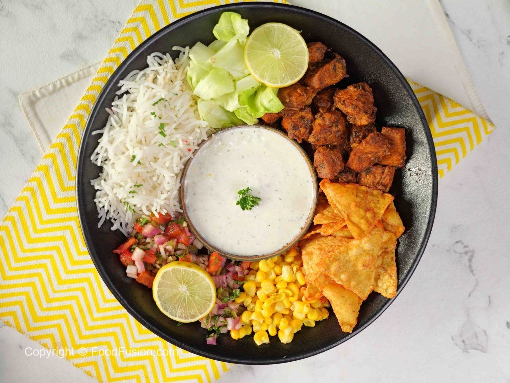 -In a serving dish, place a small bowl in the center, add yogurt sauce in the bowl, add prepared chipotle chicken, boiled rice, prepared tomato salsa, sweet corn, tortilla chips, ice-berg & serve!