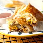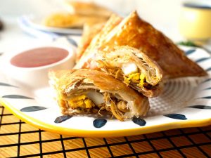 On each puff pastry square,add prepared filling & egg wedge in the center (skip egg if storing),apply water on the edges,flip the other side & press the edges to stick together and prick with fork to seal the edges (makes 18).