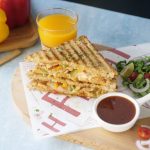 On both bread slices,drizzle tomato ketchup and add prepared chicken fajita filling on one bread slice.