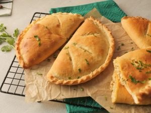 -On baking try (greased with cooking oil and lined with butter paper),place rolled dough,on half side of the dough,add chicken filling,apply water and fold the other side over it,press and apply water and seal the edges.
