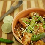Add tomato paste (already prepared) mix well and cover. When chicken is tender and gravy is formed, add crushed cumin, coriander powder, ginger, dried fenugreek, and green chili. Mix well and cover for 5 minutes.