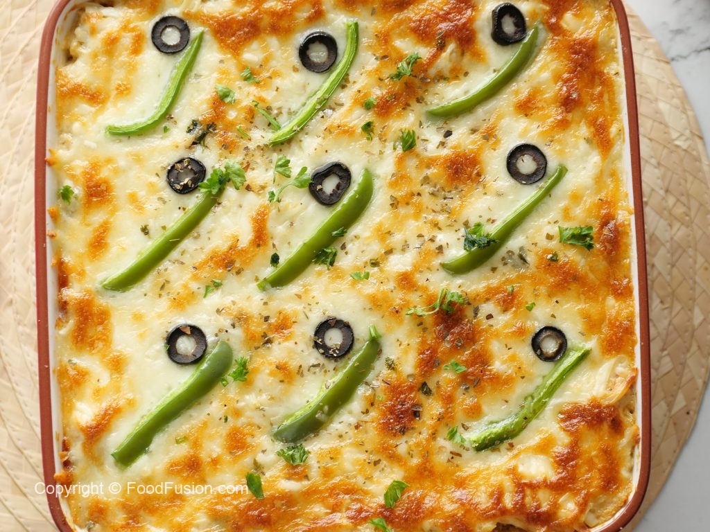 -Place lasagna sheets,add prepared chicken filling,olive oil,prepared creamy white sauce,fresh parsley,cheddar cheese,mozzarella cheese,lasagna sheets,prepared chicken filling,olive oil,prepared creamy white sauce,fresh parsley,cheddar cheese,mozzarella cheese,lasagna sheets,prepared chicken filling,olive oil,creamy white sauce,fresh parsley,cheddar cheese,mozzarella cheese, capsicum,black olives & sprinkle dried oregano.
