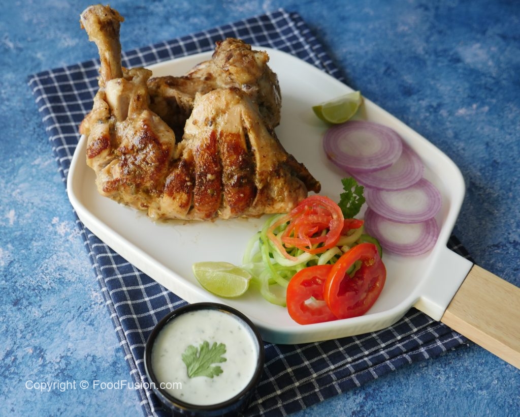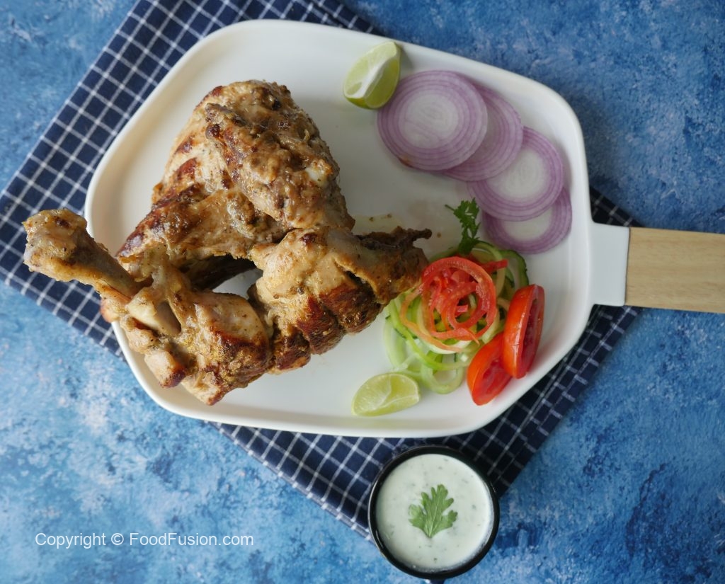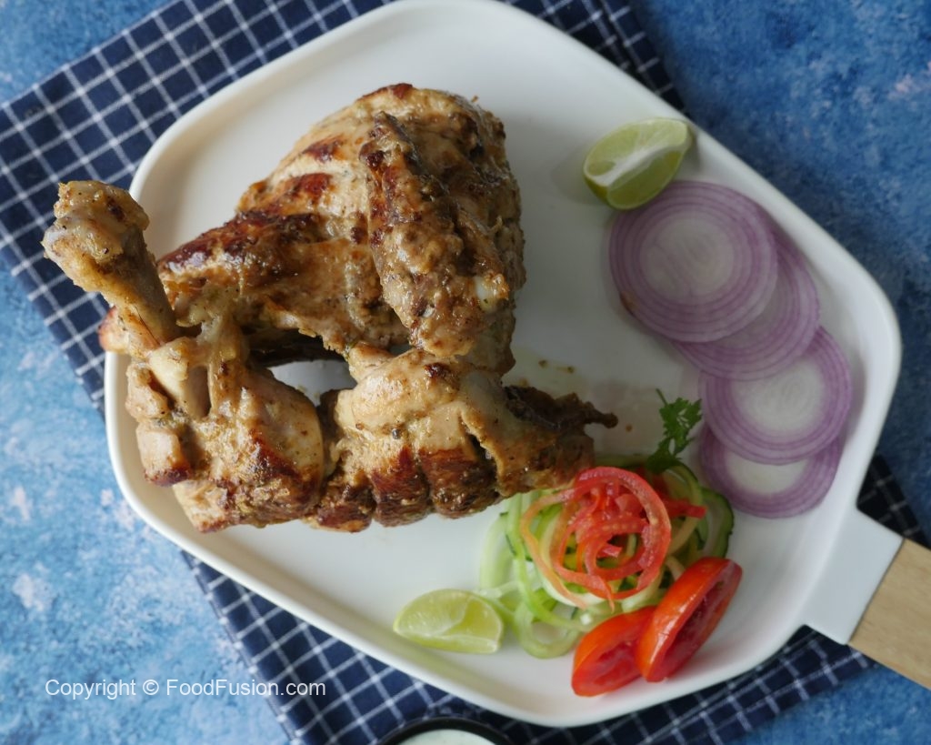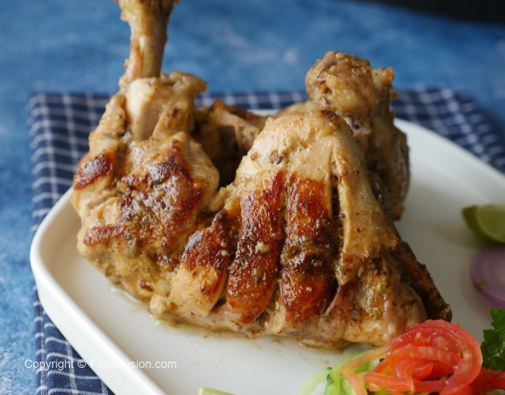 In frying pan,add cooking oil and marinated chicken pieces,cover and cook on low flame 20-25 minutes and keep turning sides in between.
