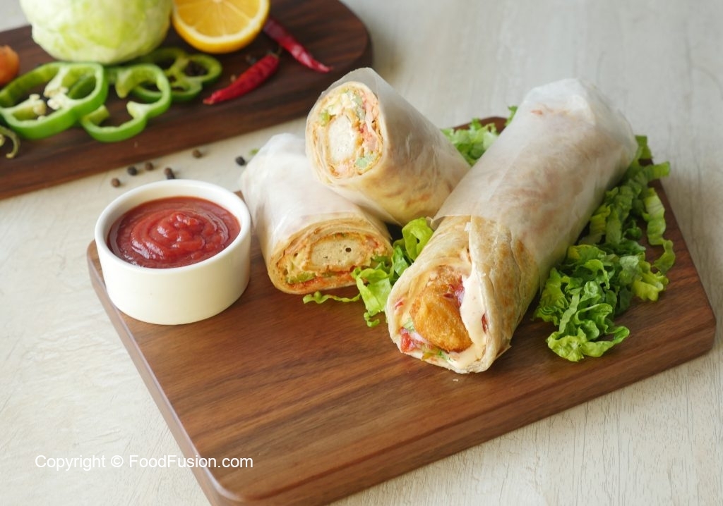 On paratha,drizzle tomato ketchup,stir fried vegetables,fried chicken nuggets and drizzle prepared cream & cheese sauce,warp in butter paper & serve!