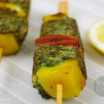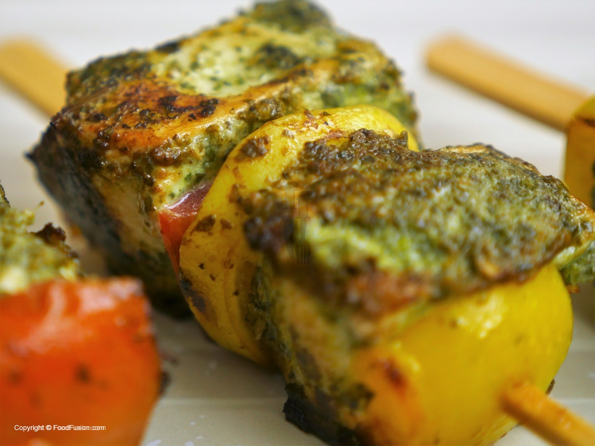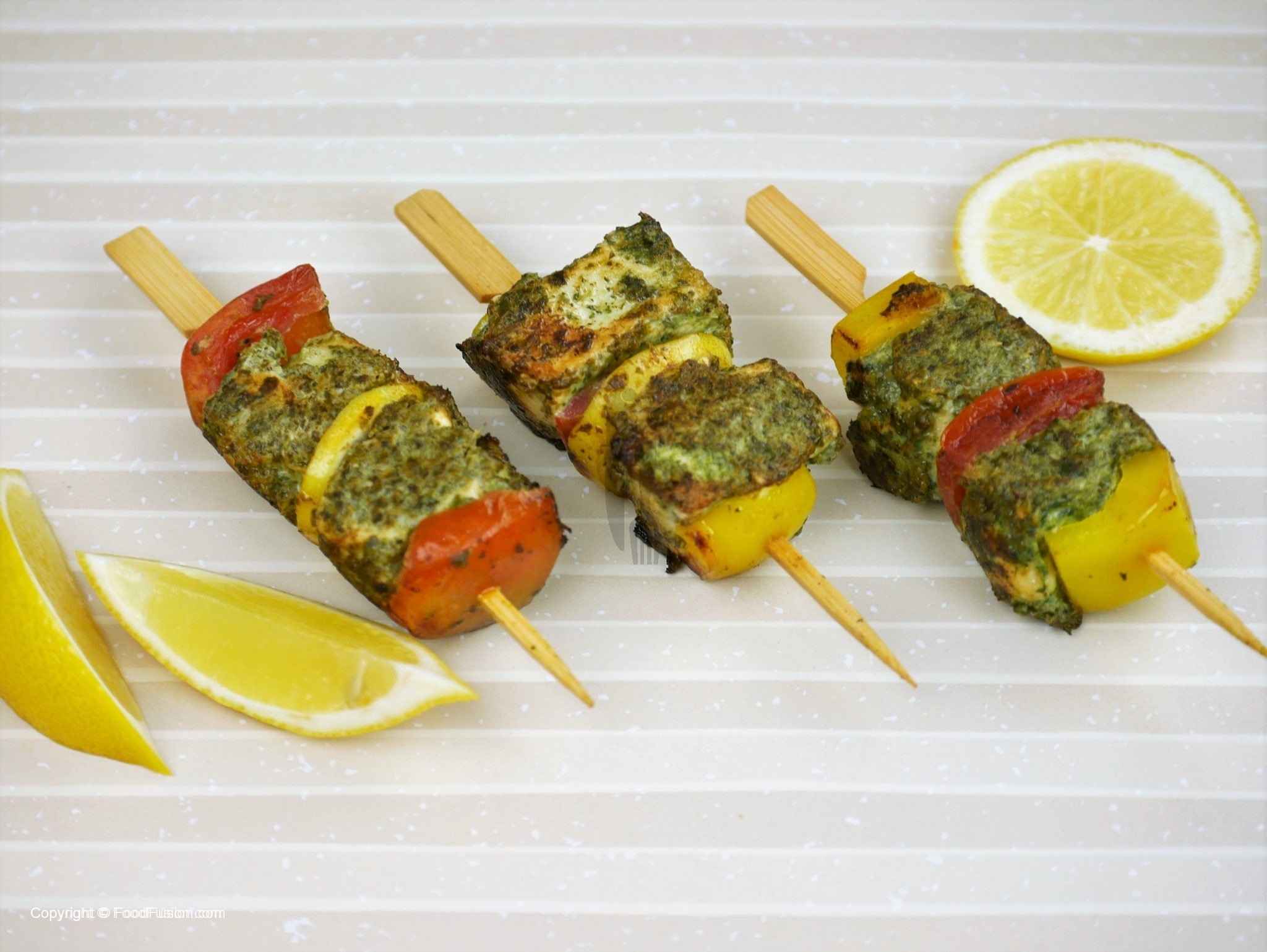 Ab marinated chicken,color bell pepper,tamatar,pyaz aur lemon slices ko skewers per assemble ker lein.