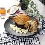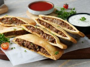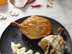 -Cut in halves, make gashes vertically on one rolled puff-pastry, place bologna slices on plain puff-pastry, add steamed chicken, now fold & wrap the chicken with puff pastry, apply egg wash on corners to seal properly then coat with another puff-pastry.