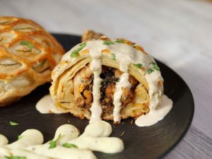 -Serve chicken wellington with mustard brown sauce & mash potatoes.